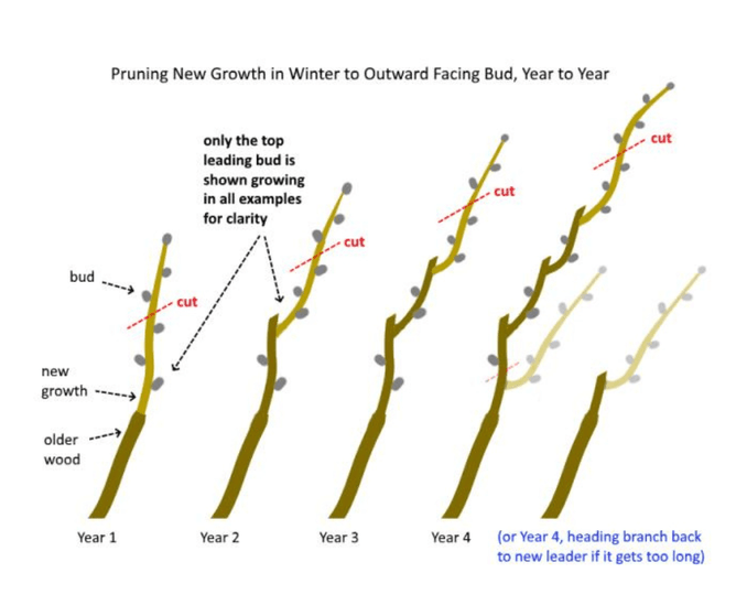 Below is an illustration of how branches are shortened each year to an outward, sideways or downward facing bud, and how the growth extends a little further each year.