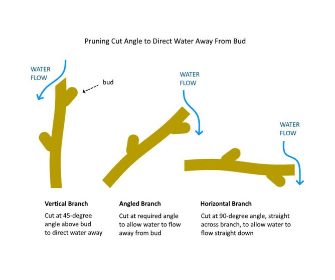 How should branches be cut if they’re not vertical? The whole point of angling the pruning cut is to direct water away from a bud, so if the branch is horizontal, make a vertical cut 6mm above a downward or sideways facing bud.