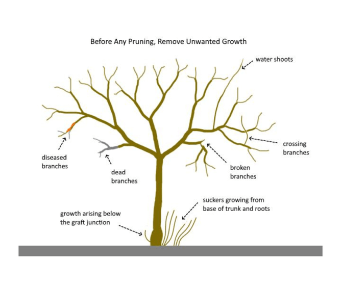 Unwanted growth must be removed first, before any pruning is done